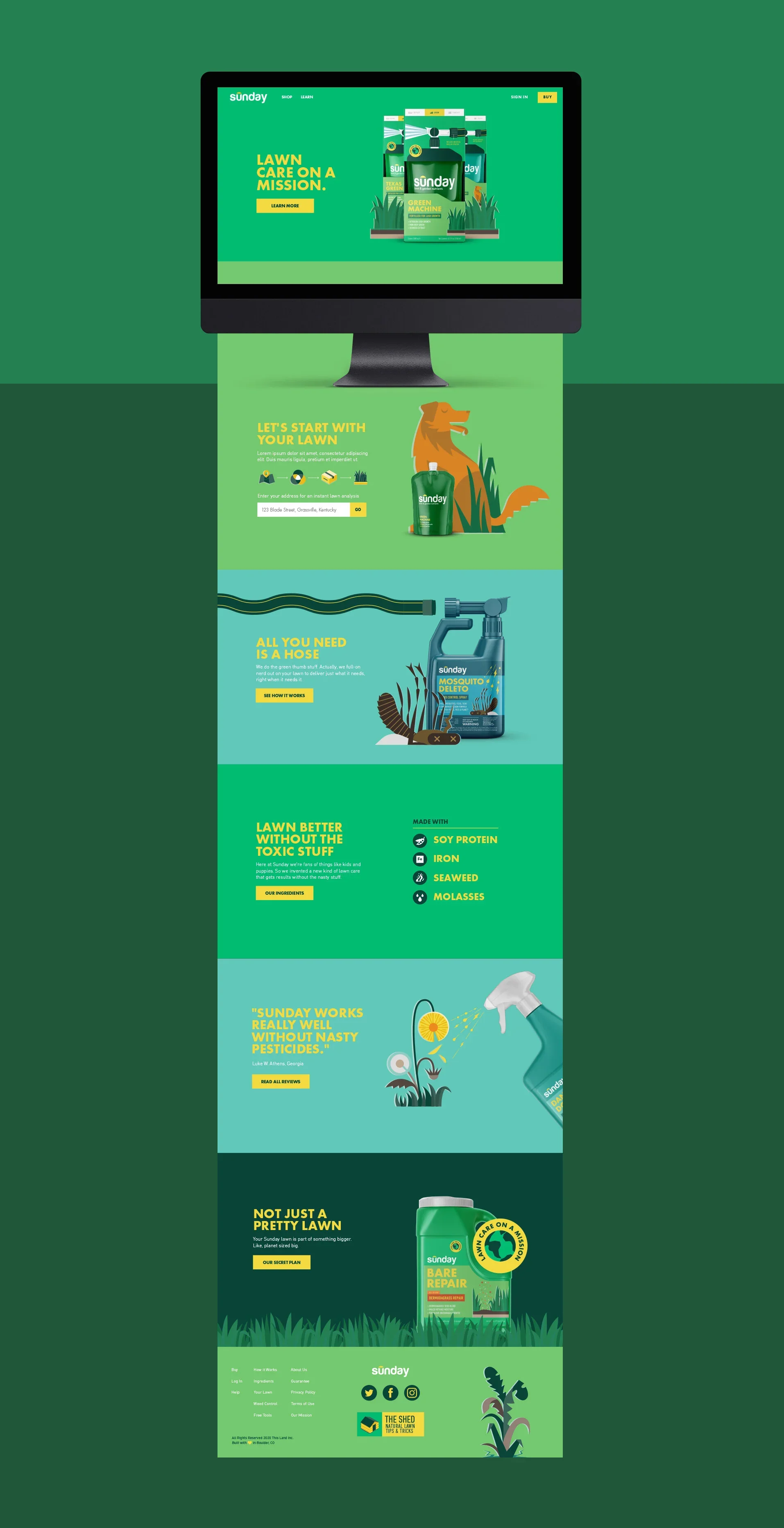 Sunday is a lawn care company dedicated to making products that are better for people, pets, and planet. Originally a strictly DTC brand, we helped them expand into retail starting in 2019 by developing a packaging design language and tone that was far more playful, warm and accessible than their clinical counterparts full of toxic chemicals (Looking at you, Round Up). We’ve had the pleasure of collaborating with them ever since on everything from packaging to signage to retail display to more custom illustrations.